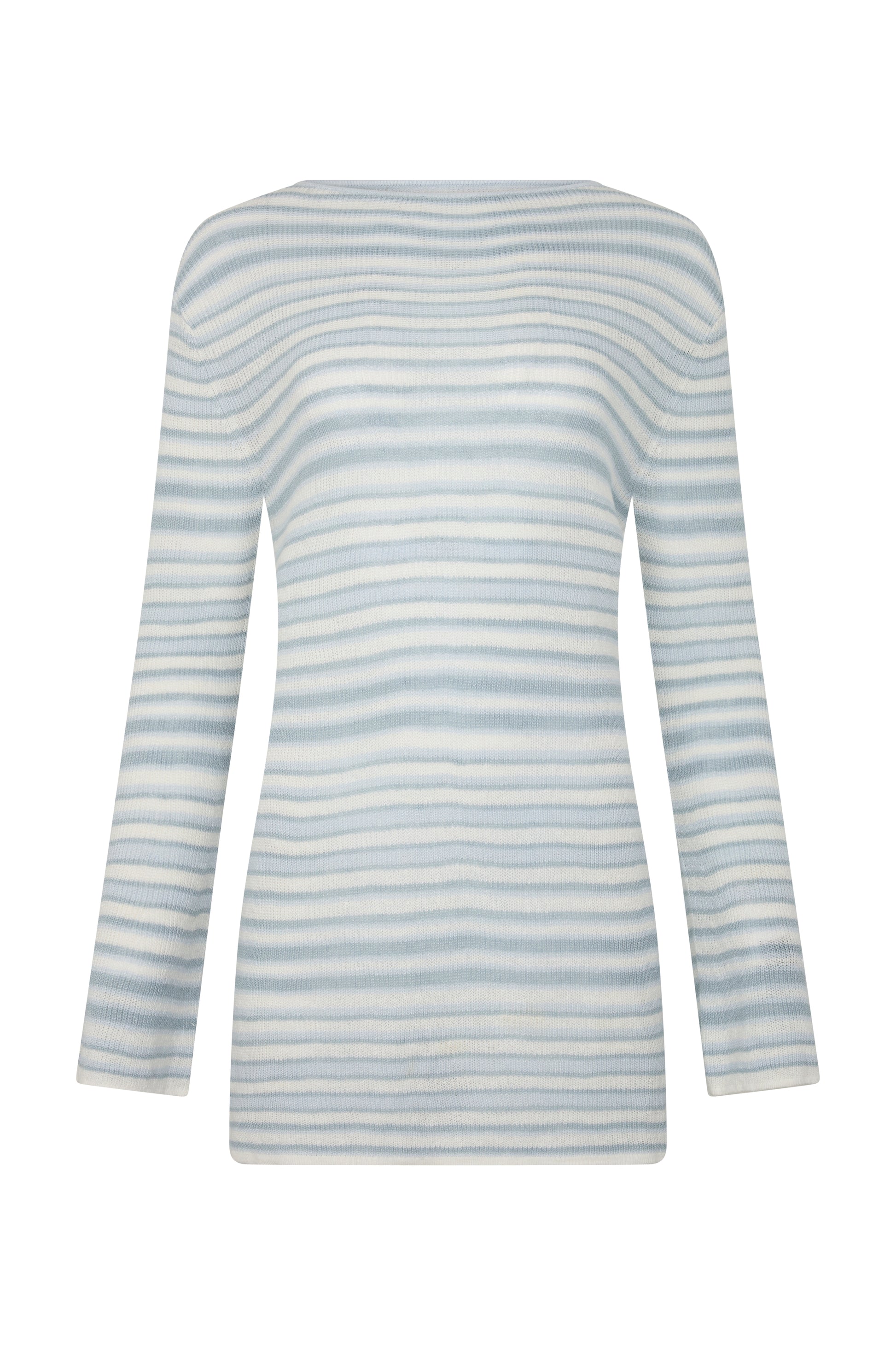 The Aura Mini Dress is the perfect transeasonal throw-on piece, crafted from 100% linen knit that will soften with wear. Adorned with an exclusive Elce stripe print, this medium-weight knit provides a slightly sheer finish. The dress features an asymmetric back cut-out, relaxed boxy fit and mini length, complemented by full-length flared sleeves and a boat neckline.