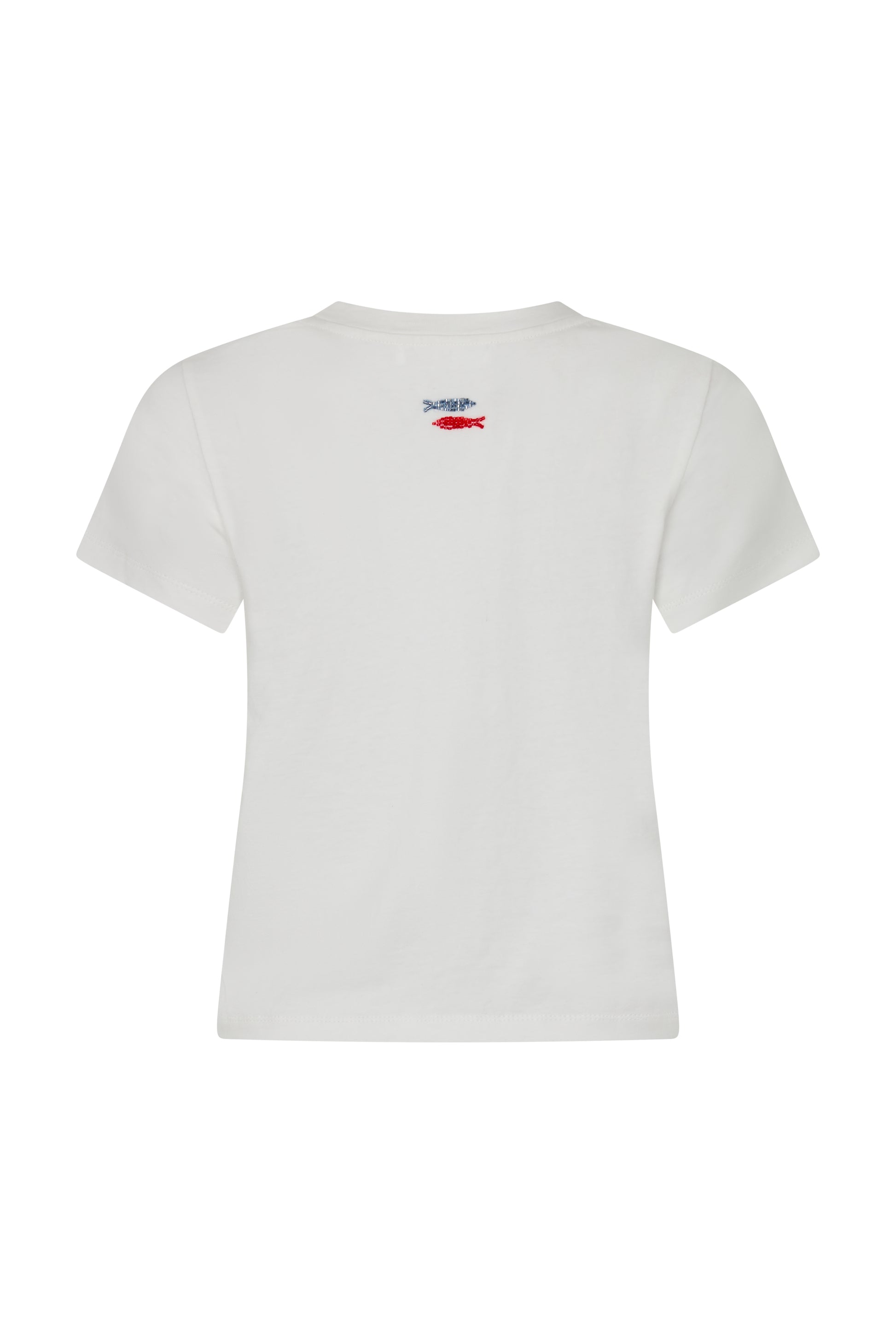 A crisp white crew-neck tee elevated with delicate beaded fish detailing. The Ciela Tee is a short-sleeved essential with a playful touch. Pairs perfelctly with your favourite resort bottoms.