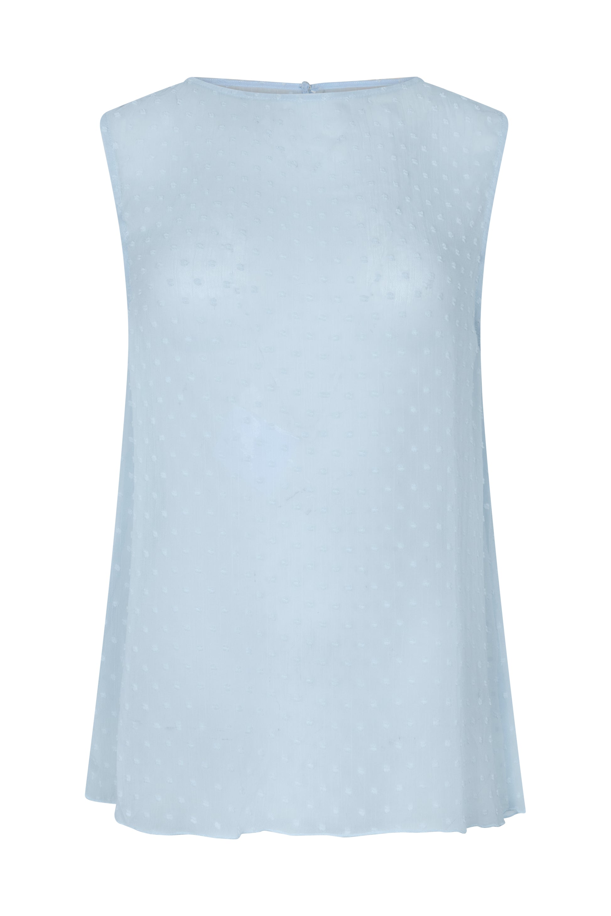The Elysia Top is a sleeveless silhouette crafted in a sheer blue dot fabrication. Designed with a relaxed fit and boat neckline, it features a subtle keyhole back with button detailing for an understated finish. Pair with the Elysia Pant to complete your look.