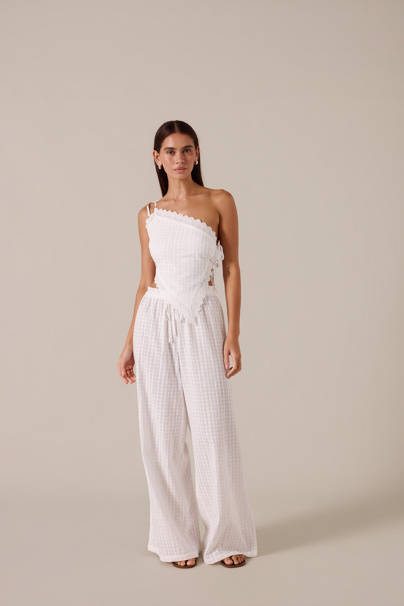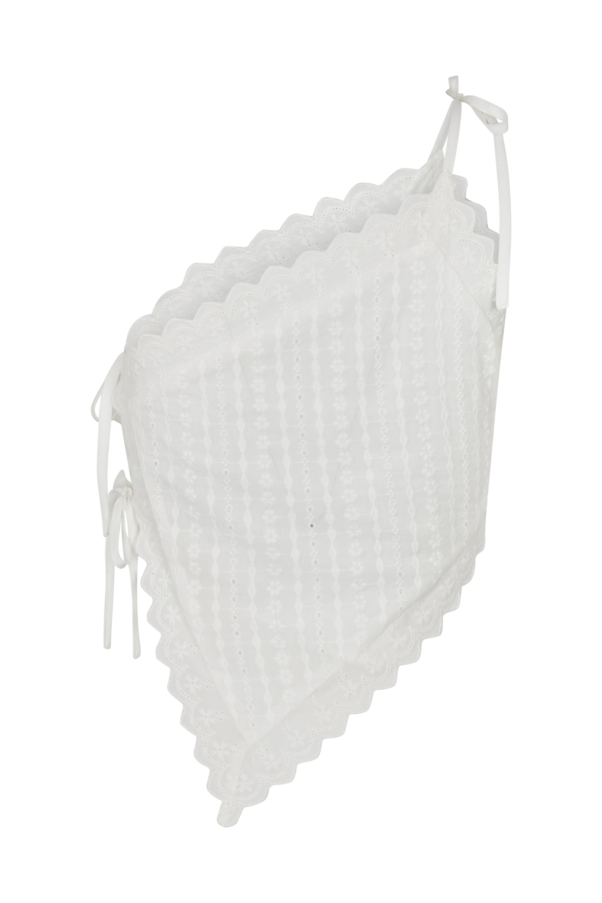 The Fiora Top is crafted from broderie fabrication with delicate doily-inspired detailing throughout. Designed with adjustable shoulder ties and an underarm tie for a custom fit, it’s finished with scalloped edging and a soft lining for ease of wear. A feminine silhouette designed for warm days and slow moments. Effortlessly pairs with the Fiora Pant.