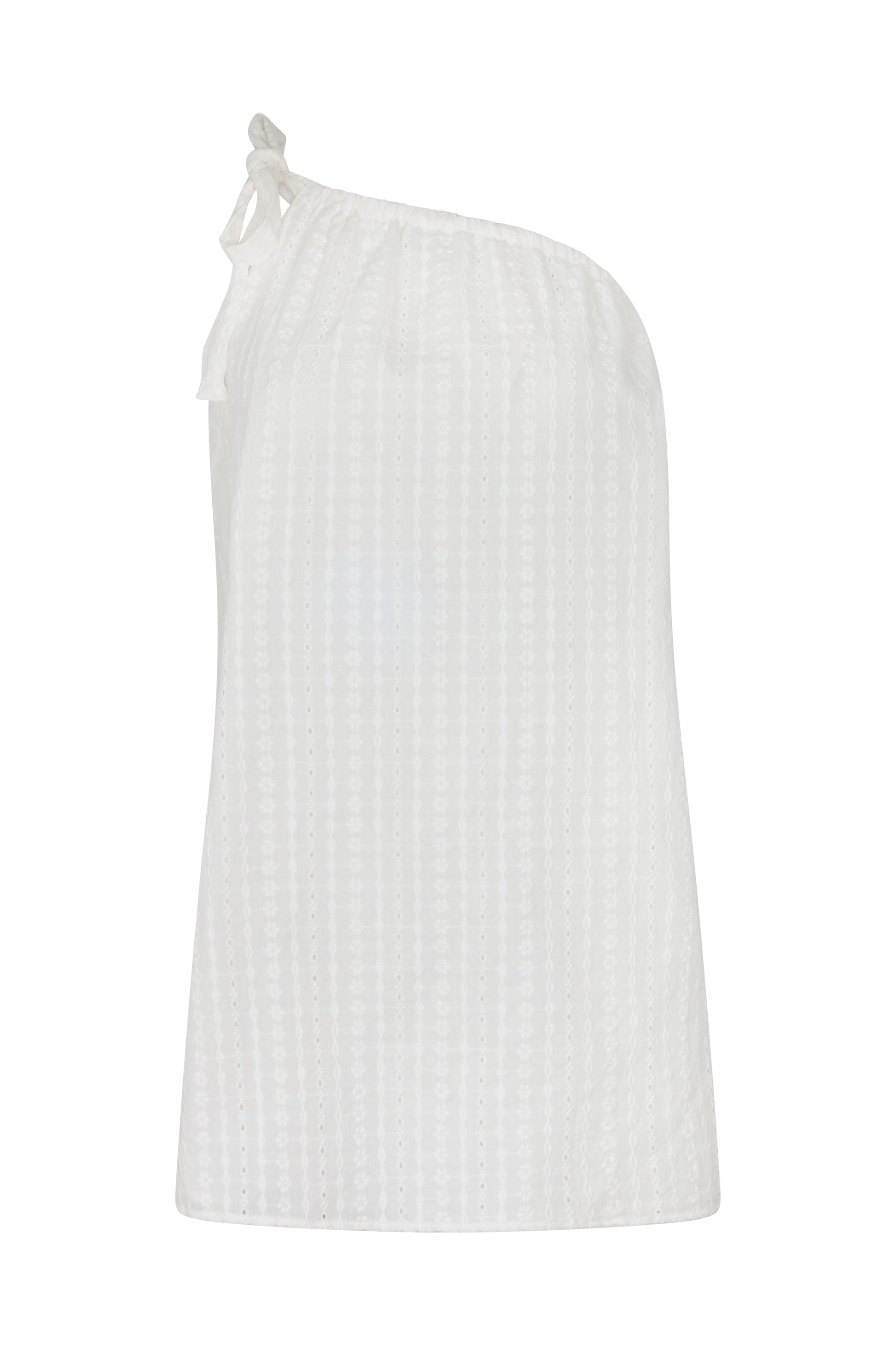 The Fiora Dress is crafted from broderie fabrication with soft gathered detailing throughout. Designed as a mini-length silhouette, it features a one-shoulder neckline with an adjustable tie for a custom fit. Fully lined for ease, it’s a feminine piece made for sundrenched days.