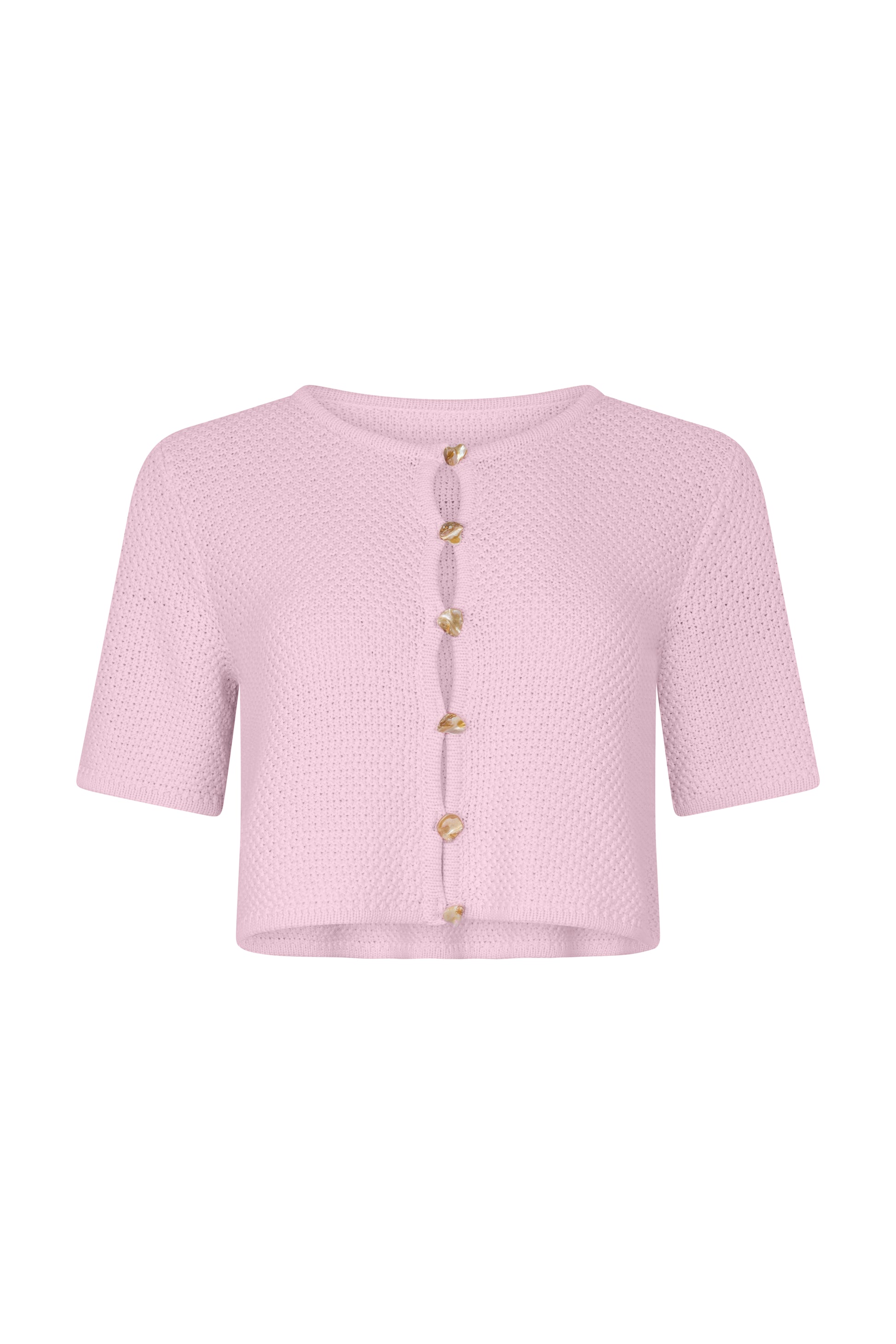 The Florent Top is crafted from a soft cable knit for a textured, elevated feel. Designed with a cropped, boxy silhouette, it offers an easy balance of structure and comfort. Short sleeves and delicate shell button detailing add a refined touch, making it an effortless piece, perfectly paired with the Florent Short.