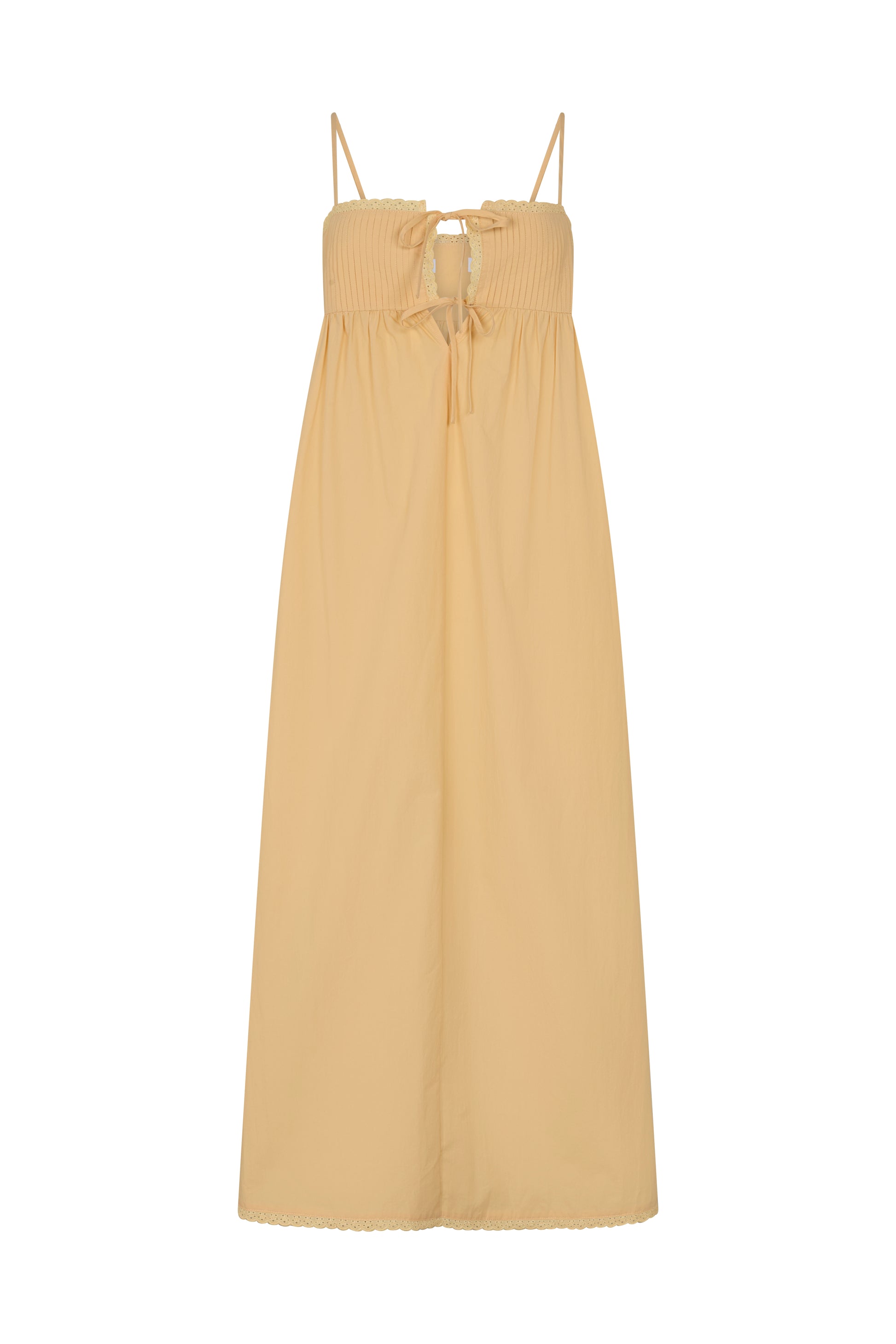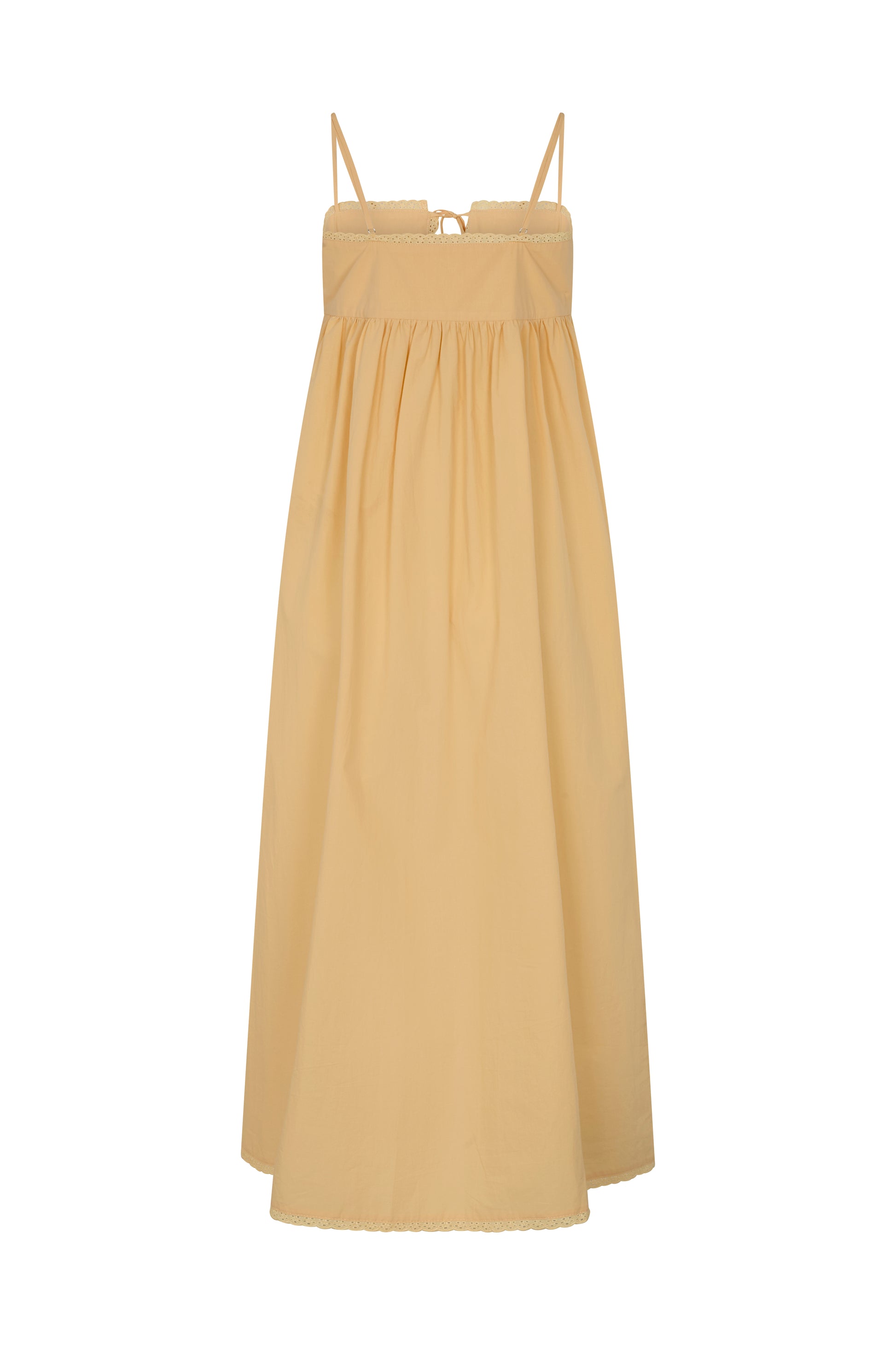 The Lilya Maxi Dress is crafted from lightweight cotton poplin with delicate lace detailing at the bust and hem. Designed with adjustable straps and a dual tie front for easy wear, it falls into a relaxed, full-length silhouette you’ll reach for again and again.
