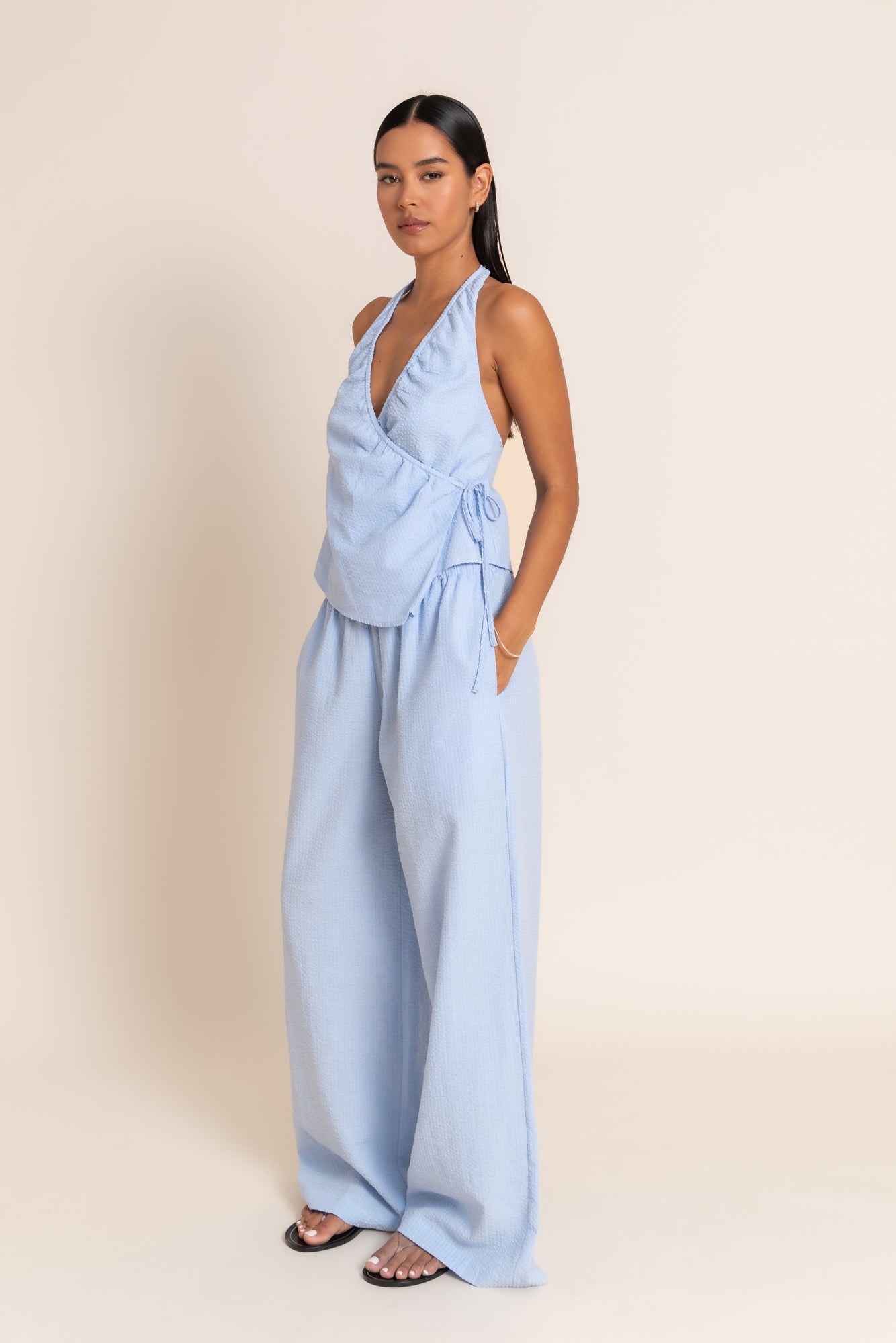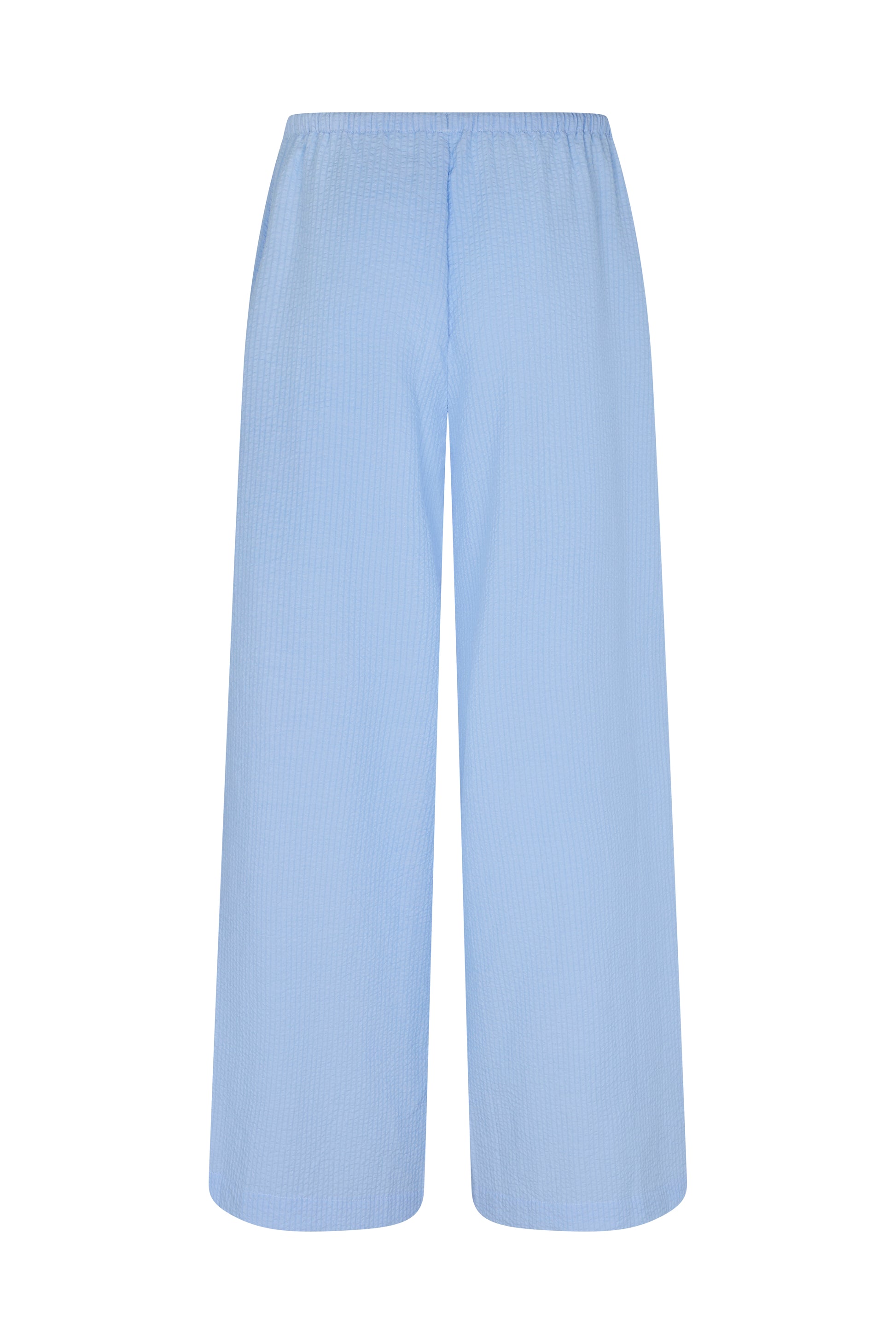 Relaxed and refined, the Lola Pant is crafted from our signature crinkle stripe fabrication for a lightweight, effortless feel. Designed with a wide-leg silhouette, the elasticated drawstring waistband and side seam pockets offer everyday ease and comfort. It's a versatile piece to wear poolside or pair back with the Lola Top for a soft, coordinated look.