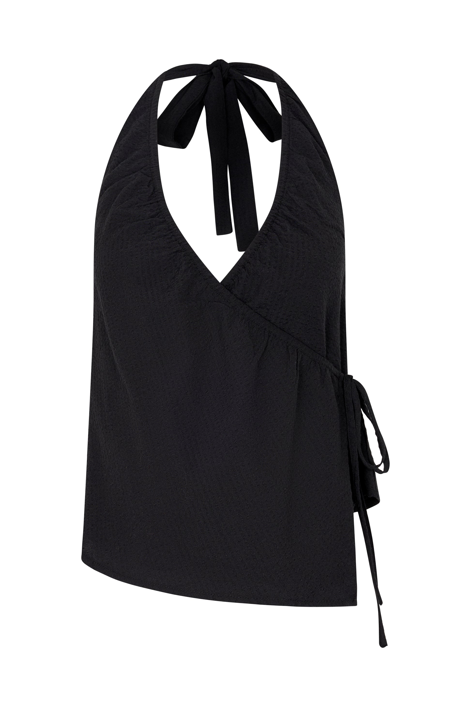 Crafted from our signature crinkle stripe fabrication, the Lola Top is a halter-style wrap silhouette designed for a custom, adjustable fit. Featuring a V neckline, internal tie, and elastic through the neck and back, it offers a softly structured shape with all-day comfort. Lightweight and feminine, style back with the Lola Pant for a relaxed yet elevated look.