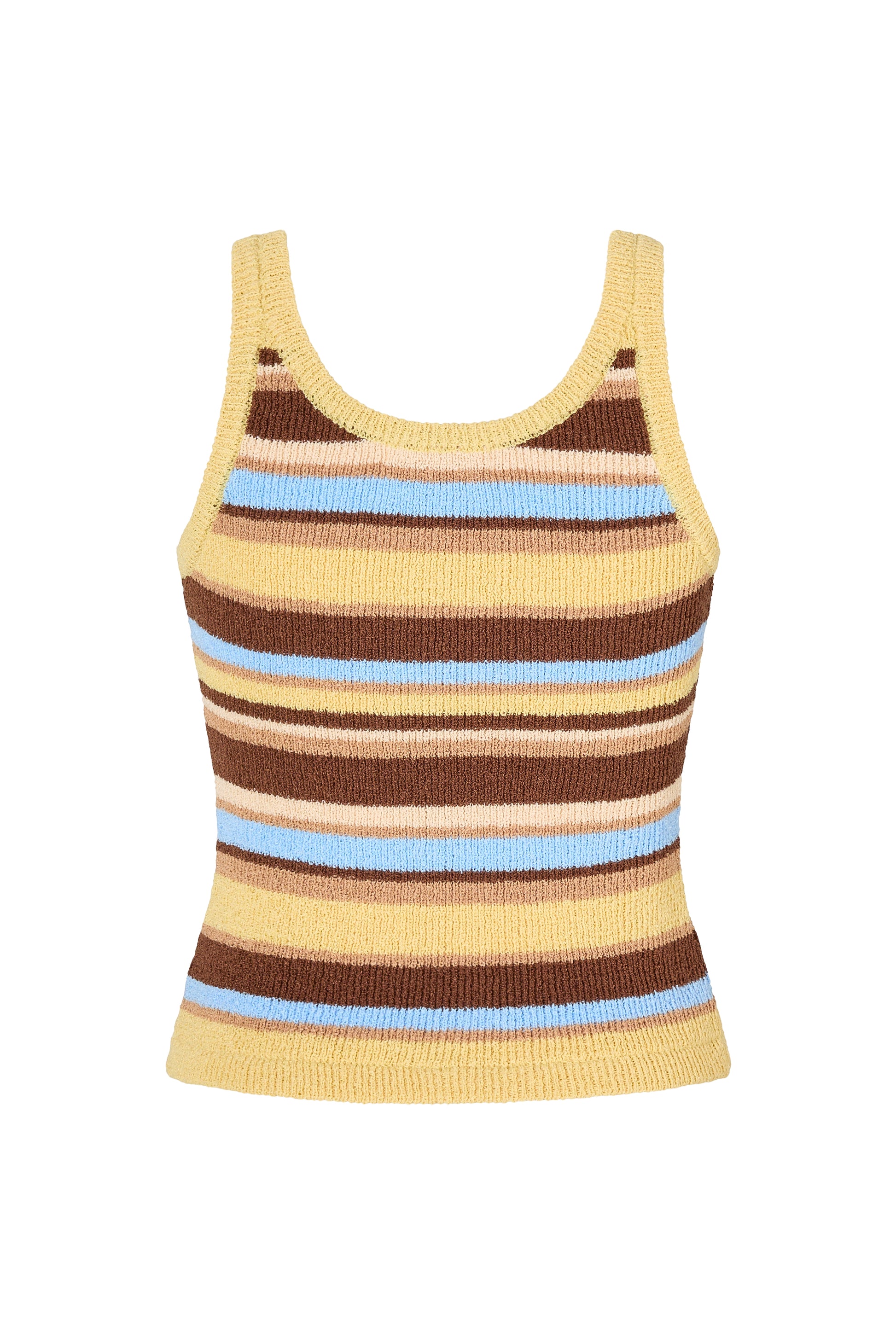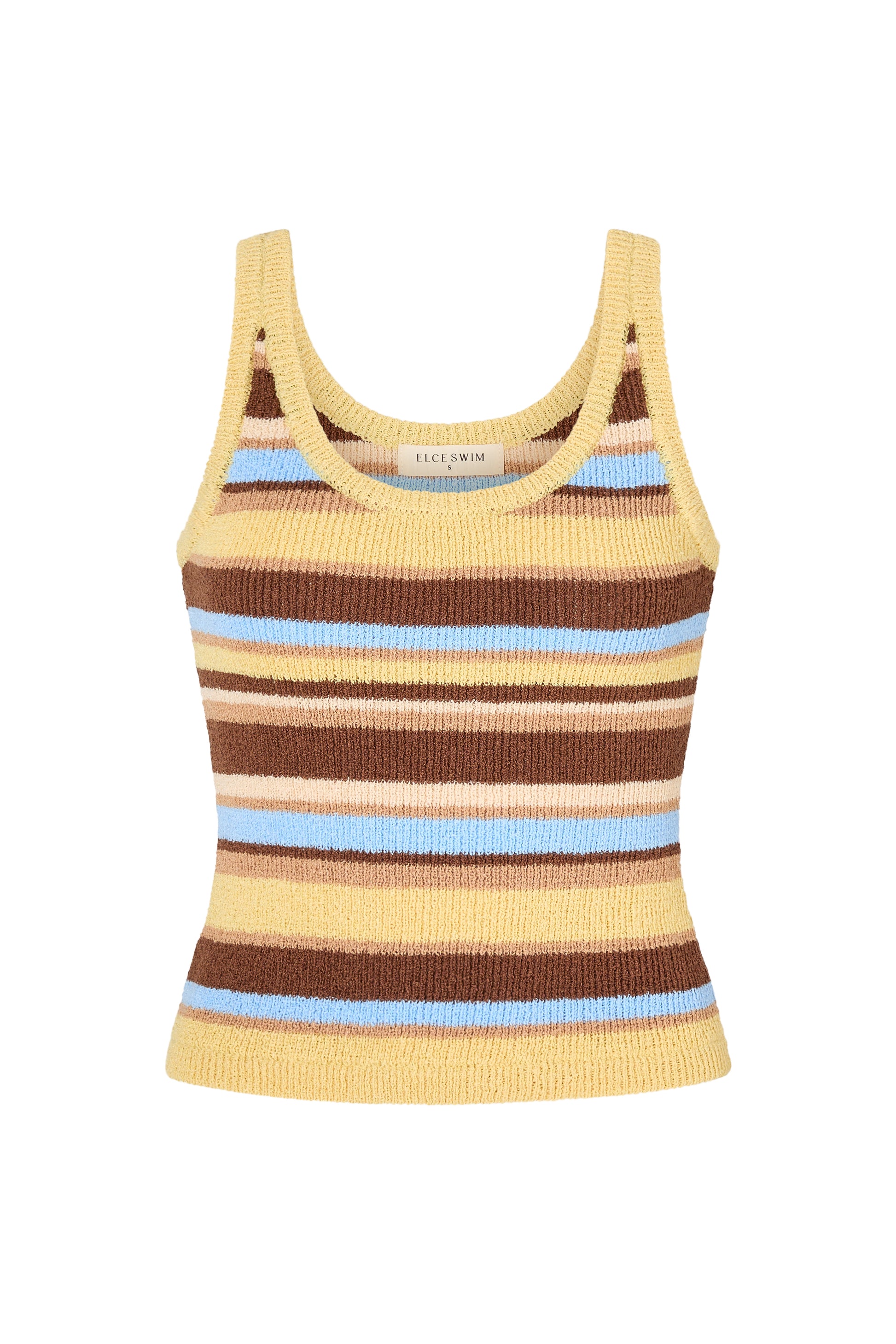 The Reine Tank in Laguna is a fitted, body-hugging style made from soft knitted fabric. Featuring a scoop neck and bold stripe pattern, it’s finished with contrast brown rib binding for a distinctive touch. Pair it with the Reine Short in Kiwi for a coordinated look.