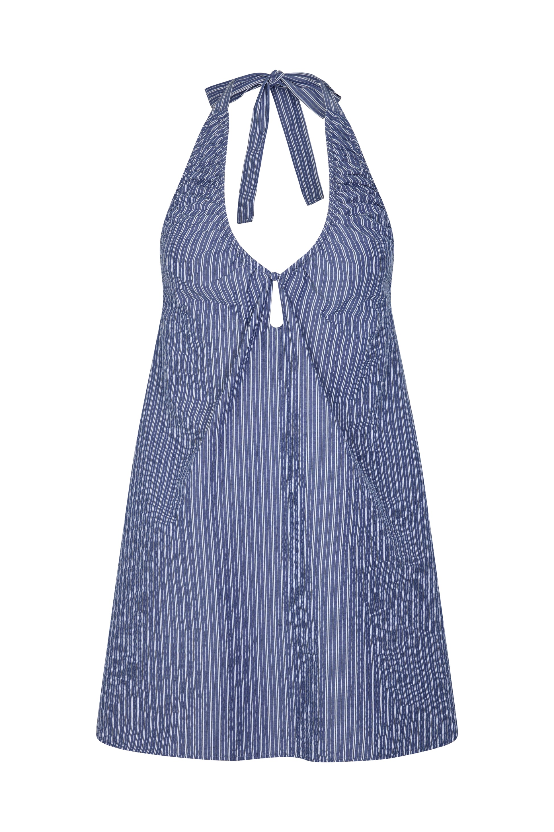 A playful silhouette with considered details. The Sidney Halter Mini Dress features a halter neckline with adjustable ties, a softly gathered low back with elasticated detailing, and a single button keyhole front detail. Lightweight and effortless — perfect for warm days and summer evenings.