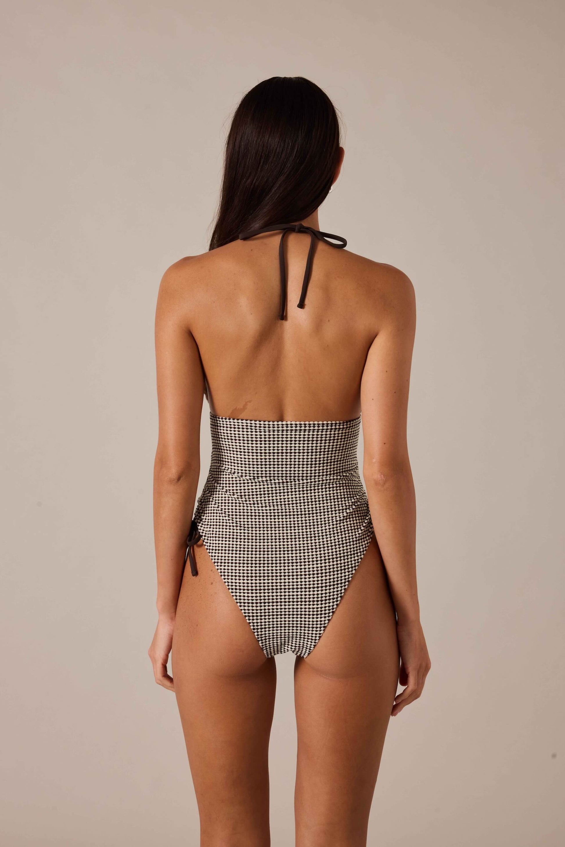 The Valeta One Piece features a refined small brown dot print in warm Cognac tones. Designed with a halter neck tie and gathered bralette-style bodice, it has subtle side ruching and a low-back silhouette for a flattering fit. Lightweight and hardware-free, it pairs back seamlessly with your favourite resort pieces.