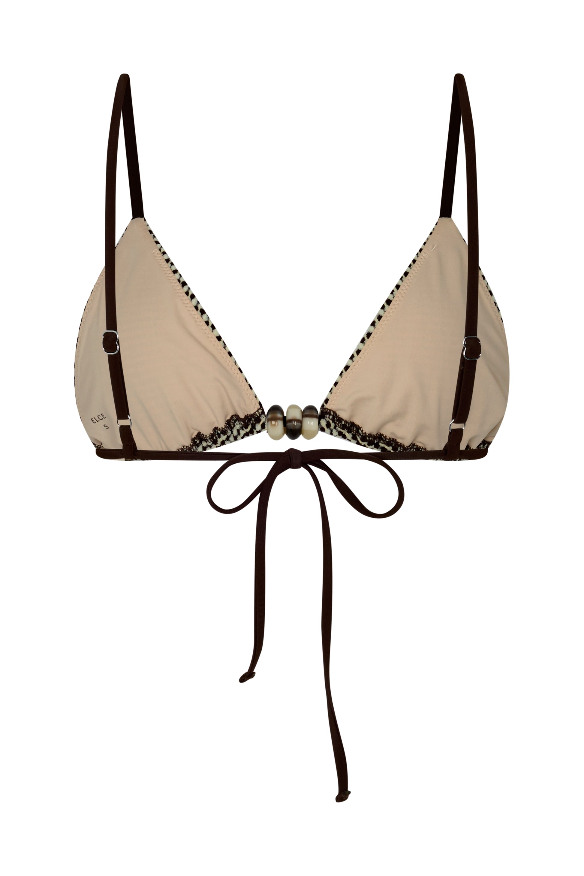 The Valeta Triangle Top features a refined small brown dot print in warm Cognac tones. Designed in a classic triangle silhouette, it’s finished with delicate beaded detailing at the front to elevate. It pairs effortlessly with the Valeta Tie Bottom for a coordinated look.