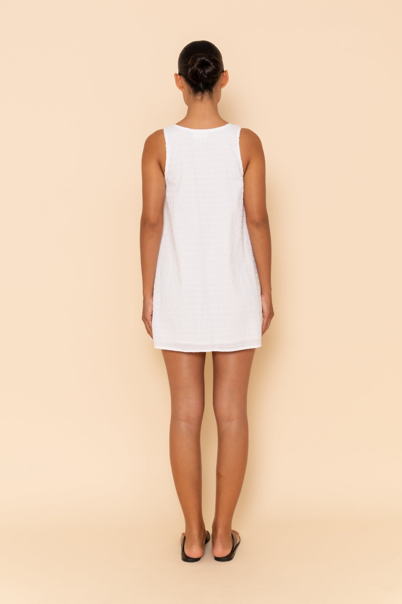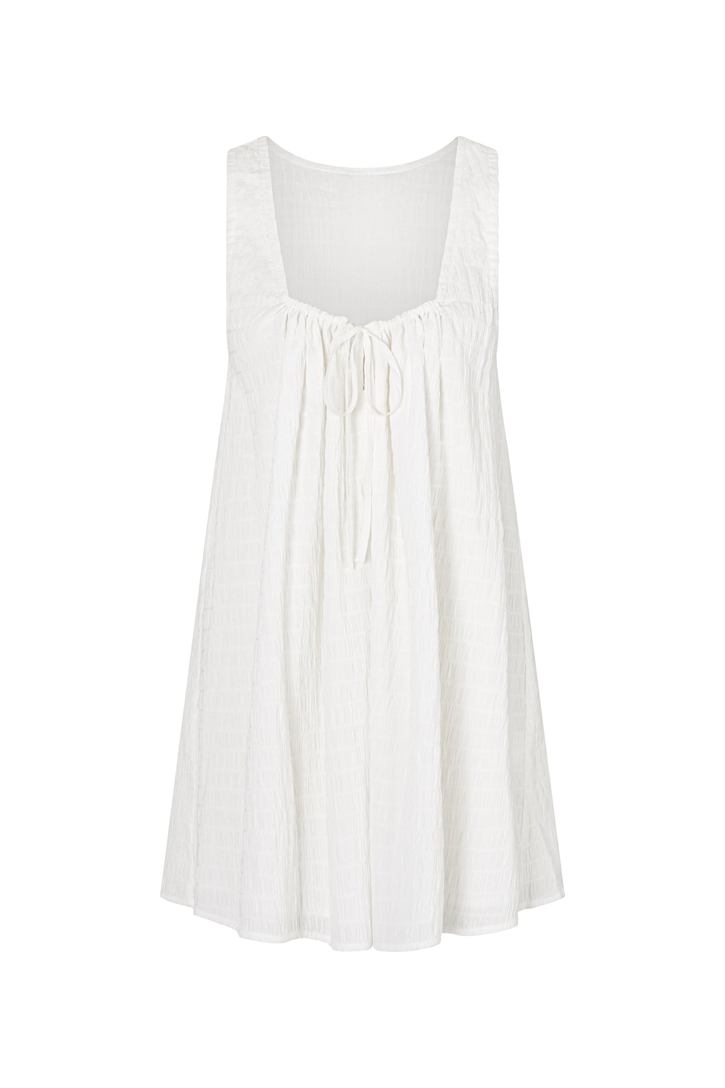 The Willow Mini Dress is a softly structured silhouette, crafted from a lightweight textured cotton blend. Featuring wide straps, a flattering square neckline, and a delicate tie front detail, it balances ease with subtle femininity. An effortlessly refined piece, perfect for warm-weather dressing.